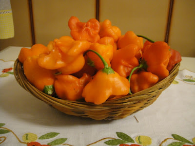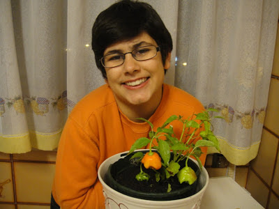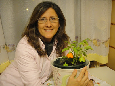 Há 3 semanas atrás ela tinha colocado no seu blog "A minha massa de pimentinhos",  um post sobre os seus pimentinhos e como fazer uma massa deliciosa para temperar a comida. Eu referi em comentários como a comida devia ficar saborosa com esse condimento e como a própria planta era bonita.